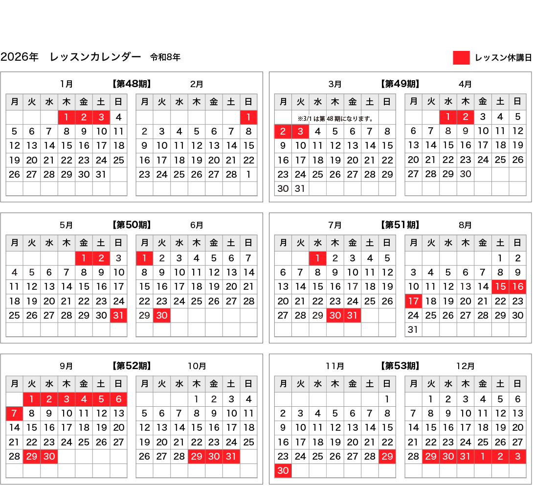 • スクールは、レッスンカレンダーにより行います。
